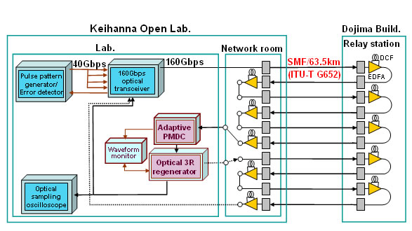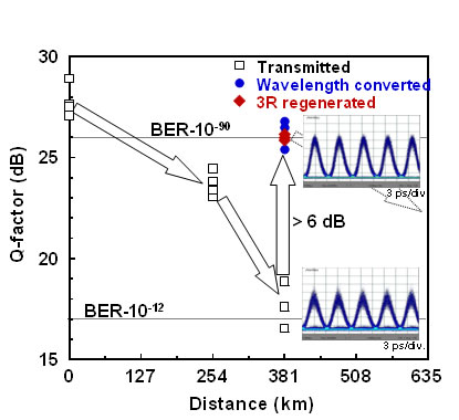導入了上述裝置的光信號再生中繼實驗驗證了原理上傳輸距離幾乎不受限制的理論。迄今為止的研究成果表明,只有在每秒40千兆位、每秒80千兆位的傳輸速度下實現了光3R中繼傳輸。在現場以每秒160千兆位的傳輸速度,實現光信號品質再生在世界上還是首創(chuàng)。而且,此次在光實驗網上,通過不斷改變線路折回次數,對中繼距離進行評估和測定,傳輸距離最長達到了380km。這樣一來,東京―─大阪間相當于只需一次光3R再生中繼,就能高品質傳輸每秒160千兆位數據的中繼距離。