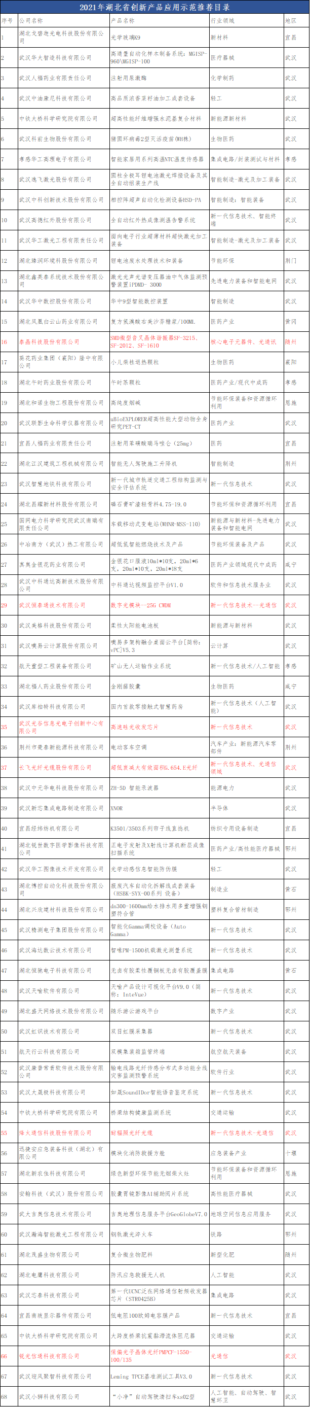 ICC訊 近日,湖北省經(jīng)濟和信息化廳、湖北省科學技術廳、湖北省發(fā)展和改革委員會、湖北省財政廳、湖北省知識產(chǎn)權局等十部門聯(lián)合公布了2021年《湖北省創(chuàng)新產(chǎn)品應用示范推薦目錄》,合計有68項產(chǎn)品入選。
