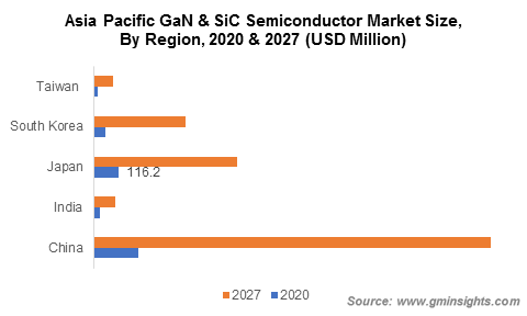 2020年,亞太GaN和SiC功率半導體市場占總收入的65%以上,由于日本政府支持該國半導體制造的積極舉措,預計2021年至2027年的復合年增長率將達到34%。例如,2020年4月,日本政府宣布提供22億美元的資金,以幫助其國內(nèi)制造商將其生產(chǎn)轉(zhuǎn)移到中國,以克服供應鏈障礙。