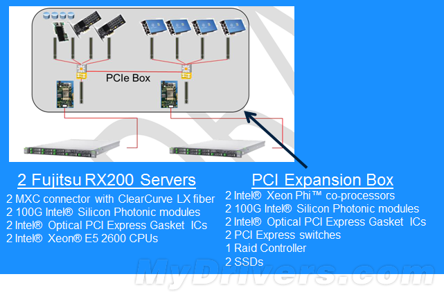 富士通使用了兩臺(tái)標(biāo)準(zhǔn)的Primergy RX200服務(wù)器,各自增加一個(gè)Intel硅光子模塊,以及一顆Intel專門設(shè)計(jì)的FPGA芯片。后者負(fù)責(zé)必要的信號(hào)調(diào)制工作,通過MXC連接器將PCI-E協(xié)議以光信號(hào)的形式傳輸?shù)綌U(kuò)展盒中。