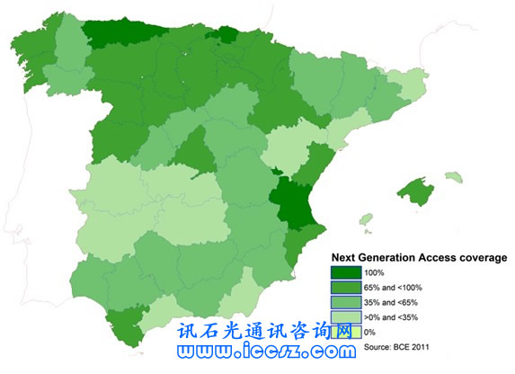 《2011歐洲寬帶覆蓋》調(diào)研報(bào)告顯示,西班牙基本寬帶覆蓋率(至少提供144kbps的服務(wù),只要他們愿意)達(dá)97%,超高速寬帶(也稱為NGA,即下一代接入)覆蓋達(dá)61%。在調(diào)研的29個(gè)國家中(歐盟27國和挪威、冰島),96%能夠獲得基本寬帶,超過50%(一半國家走向2020數(shù)字天堂目標(biāo))能夠獲得超高速。