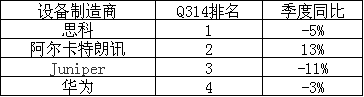 思科、阿爾卡特朗訊、Juniper和華為是服務(wù)供應(yīng)商路由器市場的主要領(lǐng)導(dǎo)者,2014年三季度它們占據(jù)該市場收入超過94%。三季度,思科仍然占有領(lǐng)先地位,阿爾卡特朗訊排名第二位,Juniper和華為分別為第三和第四大供應(yīng)商。
