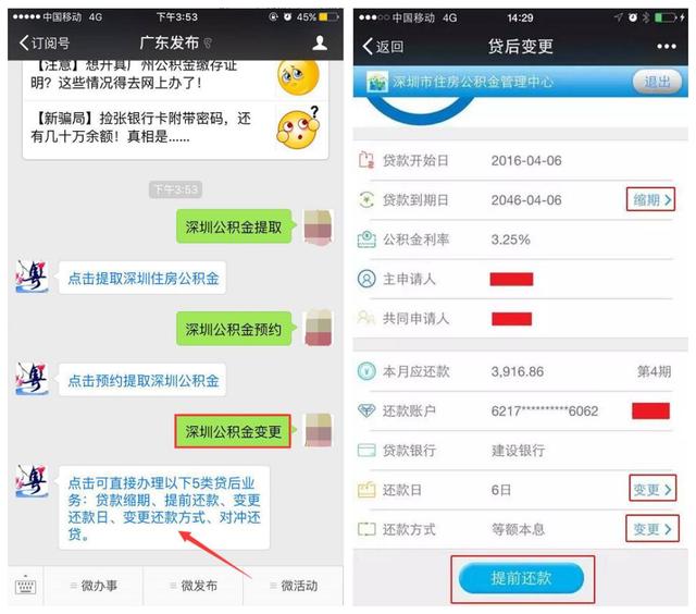 1、關(guān)注 “廣東發(fā)布”(微信號:gdfabu0710) ,回復(fù)“深圳公積金變更”,可直接辦理以下5類貸后業(yè)務(wù):貸款縮期、提前還款、變更還款日、變更還款方式、對沖還貸。