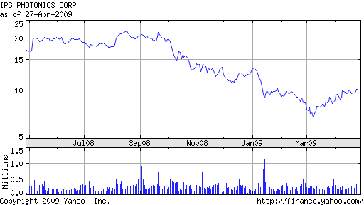 在光纖激光器市場,相比其他競爭者,IPG的優(yōu)勢在于擁有多于競爭者2-3年的研發(fā)經(jīng)驗。因此,在目前經(jīng)濟衰退的情況下,IPG的市場份額開始擴大。