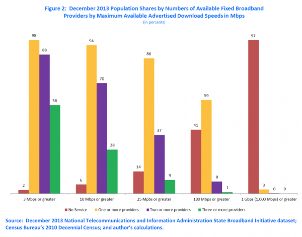 報告還指出,美國人中有86%的用戶可以訪問至少25Mbps的互聯(lián)網(wǎng)連接,其中有37%的用戶可以從兩個或多個ISP中選擇,9%的用戶可以從3個或以上的ISP當中選擇。同樣,對于10Mbps寬帶,這個數(shù)字分別是94%,70%和28%。