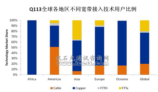世界各地對寬帶技術(shù)的采用有著顯著差異。在美洲,50%的固定寬帶用戶使用Cable服務(wù)。該地區(qū)同時也是FTTH技術(shù)的主要市場,盡管其它光纖技術(shù)尚未發(fā)揮影響。亞洲是最大的FTTx市場,其中臺灣、香港和日本擁有最高的FTTx家庭滲透率。