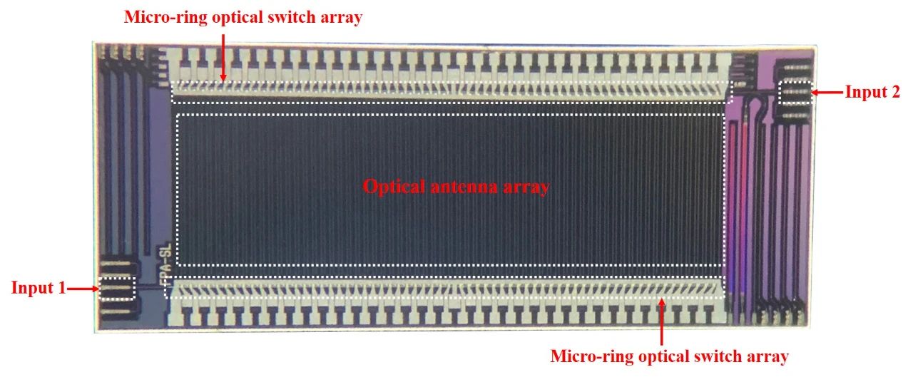 合作團(tuán)隊(duì)研制了一種比MZI二分樹(shù)結(jié)構(gòu)更緊湊的基于微環(huán)開(kāi)關(guān)陣列的FPA芯片。所研制的FPA芯片操作復(fù)雜度極低,在工作時(shí)僅開(kāi)啟一個(gè)光開(kāi)關(guān),將芯片總功耗從log2N×P進(jìn)一步降低到P。通過(guò)將光切換到不同位置的天線(xiàn)并且調(diào)節(jié)輸入波長(zhǎng),實(shí)現(xiàn)了FPA芯片的二維掃描。該芯片采用了視場(chǎng)拼接技術(shù),在1520 nm至1590 nm的波長(zhǎng)范圍內(nèi),設(shè)置8根具有不同掃描范圍的天線(xiàn),這些天線(xiàn)的視場(chǎng)彼此略有重疊,嚴(yán)格拼接出了大于40°的整體視場(chǎng);并采用旋轉(zhuǎn)對(duì)稱(chēng)結(jié)構(gòu),雙端輸入激光,將橫向視場(chǎng)擴(kuò)展至80°以上??傮w上該FPA實(shí)現(xiàn)了相當(dāng)于8線(xiàn)激光雷達(dá)的二維掃描,視場(chǎng)角為82°× 32°,光束發(fā)散為0.07°×0.07°,光束的背景抑制比大于20 dB。該芯片具有可擴(kuò)展性,當(dāng)使用更多的天線(xiàn)進(jìn)行視場(chǎng)拼接和級(jí)聯(lián)更多的光開(kāi)關(guān)時(shí),預(yù)計(jì)可以實(shí)現(xiàn)更大范圍的二維掃描。