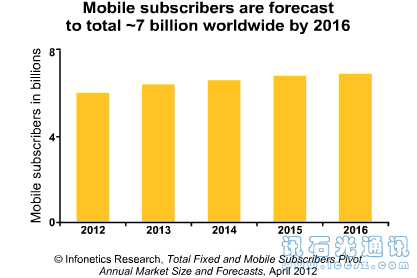 移動用戶數(shù)——包括GSM, W-CDMA, LTE, TD-SCDMA, cdmaOne, CDMA2000,預(yù)計在2012年將突破60億大關(guān),2016年將達70億。