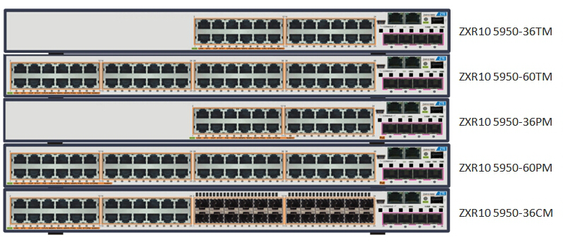 同時(shí)發(fā)布的ZXR10 5950交換機(jī)是中興通訊針對(duì)企業(yè)用戶推出的三層全千兆路由盒式交換機(jī),具備全面的二層交換和三層路由能力,支持豐富的安全和可靠性機(jī)制,可以廣泛應(yīng)用于園區(qū)網(wǎng)匯聚接入,數(shù)據(jù)中心千兆接入、桌面千兆接入等多種場(chǎng)景,為各類企業(yè)用戶提供高帶寬可靠的解決方案。ZXR10 5950系列設(shè)備固定端口可提供24口、48口的全千兆R(shí)J45和10G SFP+(5950-36CM采用COMBO接口,光口電口靈活配置)。上行端口既可采用固定的10GE SFP+端口,又可靈活選擇40GE上行口,40GE堆疊端口,或可選擇10GE SFP+作為上行接口。5950系列還推出兩款POE交換機(jī)5950-36PM和5950-60PM,方便連接POE接入需求的終端設(shè)備。