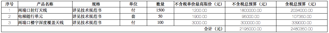 按照之前的招標(biāo)計(jì)劃,本項(xiàng)目不含稅總預(yù)算為219.50萬元,含稅總預(yù)算為248.04萬元。采購兩端口射燈天線、電梯隨行單元和兩端口樓宇深度覆蓋天線三類物資,攻擊1650套。采購內(nèi)容及基準(zhǔn)價(jià)表如下: