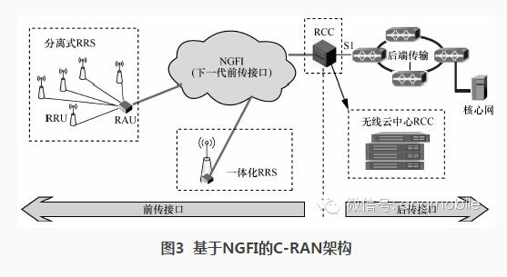 NGFI通過重構(gòu)RRU和BBU之間的接口,提供大帶寬、低時延、靈活可擴展的前傳能力。具體做法是NGFI將部分BBU處理功能移至RRU上,在功能重構(gòu)后的BBU集中化、虛擬化,形成無線云中心RCC,功能重構(gòu)后的RRU形成射頻拉遠系統(tǒng) RRSNGFI將兩者之間點對點傳輸升級為多點對多點的網(wǎng)絡傳輸。這樣看來,NGFI介于前傳和后傳之間,也可以稱為中傳,即xHaul。