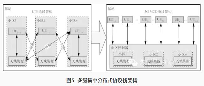 傳統(tǒng)協(xié)議棧是以小區(qū)為中心進行用戶接入、標識和無線資源管理,帶來復雜的移動性管理和不一致的用戶體驗,無法滿足用戶為中心網(wǎng)絡的設計目標,需要對協(xié)議棧進行重設計。MCD(多級集中分布式協(xié)議棧)技術(shù)的目標是讓用戶獨立于小區(qū),成為與小區(qū)平等的協(xié)議?;驹刂?。