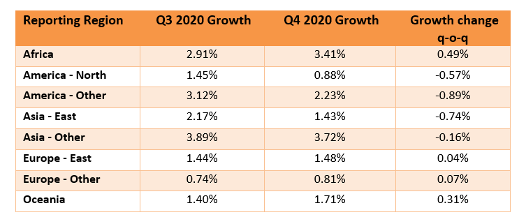 Figure 5. Quarterly growth in fixed broadband subscribers by region, Q4 2020 vs Q3 2020. Source: Point Topic.