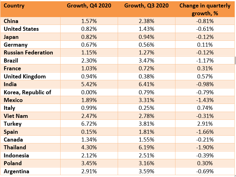 2020年第四季度,有四個(gè)地區(qū)的增長(zhǎng)率與上一季度相比有所放緩。 在美洲和東亞,差異尤為明顯(圖5和6)。