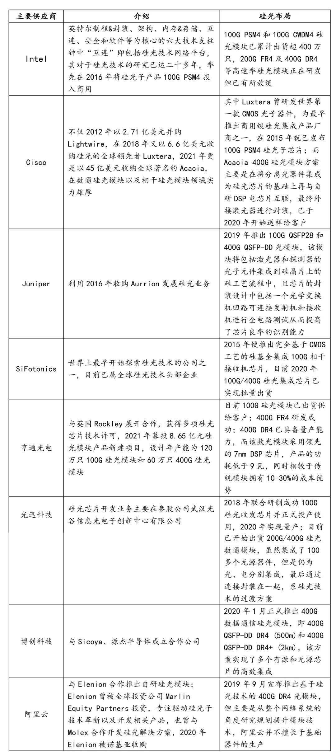硅光技術(shù)作為全球光通信近十年變革的源動(dòng)力,傳統(tǒng)通信設(shè)備巨擘及各類細(xì)分行業(yè)有競(jìng)爭(zhēng)力的企業(yè)紛紛入場(chǎng)布局,國(guó)外企業(yè)如Intel、Acacia等均已推出多款基于硅光技術(shù)的器件產(chǎn)品并率先實(shí)現(xiàn)量產(chǎn),成為業(yè)內(nèi)領(lǐng)頭羊。國(guó)內(nèi)企業(yè)則普遍較晚進(jìn)入該領(lǐng)域,主要通過并購或與外企協(xié)作的模式來切入硅光市場(chǎng),在產(chǎn)品開發(fā)進(jìn)度及技術(shù)研究方面存在明顯的差距。從整體市場(chǎng)來說,光通信市場(chǎng)對(duì)硅光技術(shù)的收購與整合也從未止步。例如Cisco先后收購了Lightwire、luxtera、Acacia等三家業(yè)內(nèi)知名硅光公司;華為收購了比利時(shí)硅光廠商Caliopa;諾基亞則收購了Elenion,該三家并購案總價(jià)值已遠(yuǎn)超50億美元,可見行業(yè)廠商對(duì)硅光技術(shù)發(fā)展的期待。