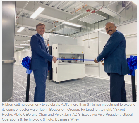 ICC訊(編譯:Nina)美國(guó)東部時(shí)間2023年7月26日--全球半導(dǎo)體領(lǐng)導(dǎo)者Analog Devices,Inc.(納斯達(dá)克:ADI)今天慶祝其投資超過10億美元的俄勒岡州Beaverton半導(dǎo)體晶圓廠的擴(kuò)建。Beaverton晶圓廠建于1978年,是ADI最大的晶圓制造工廠,為工業(yè)、汽車、通信、消費(fèi)和醫(yī)療保健等關(guān)鍵行業(yè)的客戶提供服務(wù)。