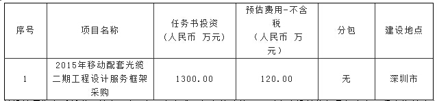 ICCSZ訊 6月24日中國電信公布深圳電信分公司2015年移動(dòng)配套光纜二期工程設(shè)計(jì)服務(wù)框架采購招標(biāo)公告,任務(wù)書投資人民幣1300萬元,具體信息如下: