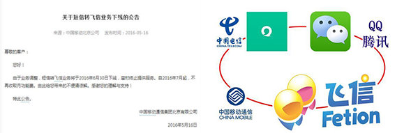 Iccsz訊 近日,中國移動在其官網(wǎng)上發(fā)布了《關(guān)于短信轉(zhuǎn)飛信業(yè)務(wù)下線的公告》,公告中稱由于業(yè)務(wù)調(diào)整,短信轉(zhuǎn)飛信業(yè)務(wù)將于2016年6月30日下線,屆時將終止提供服務(wù)。有媒體對此解讀為“飛信已死”,并在互聯(lián)網(wǎng)上廣泛傳播。