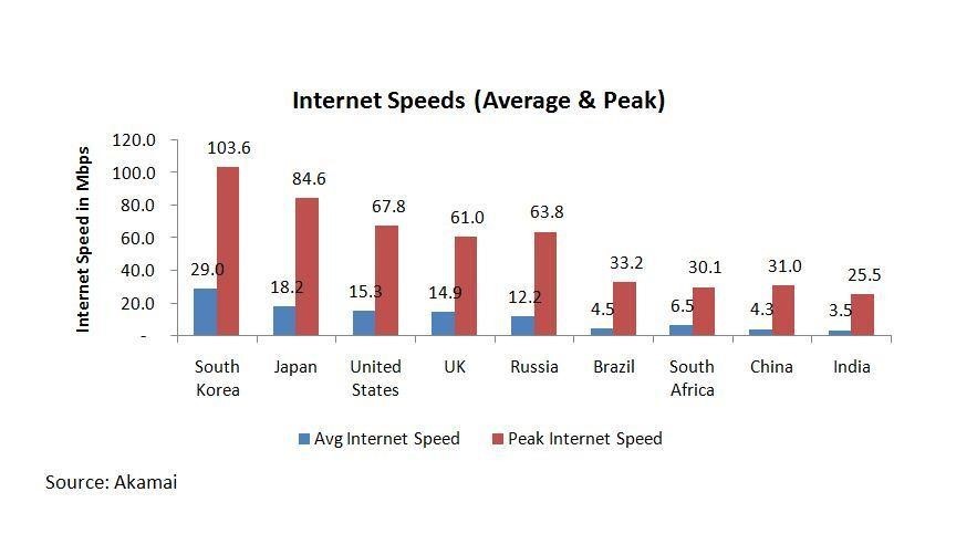 此外,行業(yè)在網(wǎng)絡(luò)速度、覆蓋范圍和客戶服務(wù)等關(guān)鍵指標(biāo)上的表現(xiàn)不盡如人意。例如,印度的平均互聯(lián)網(wǎng)速度為3.5 Mbps,而韓國則為29 Mbps,美國為15 Mbps,中國則為4.3Mbps(見下圖)。