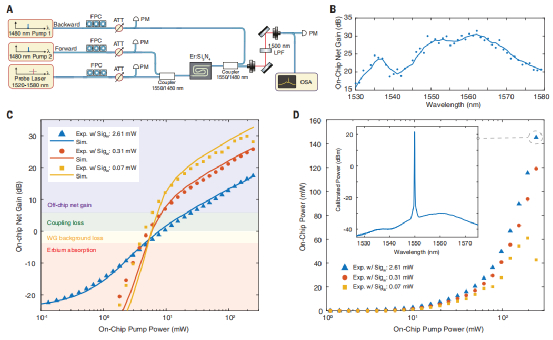 近十年來,集成光子學的快速發(fā)展和器件加工工藝的不斷提升,對在主流集成光子材料平臺上實現(xiàn)摻鉺波導放大器,研究人員重新產(chǎn)生了濃厚興趣,此前已有團隊制備出摻鉺氧化鋁和摻鉺鋰酸鈮放大器等。