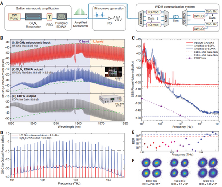 另外,課題組利用片上放大后的重復頻率為 100GHz 的孤子光頻梳,單載波功率最高超過 1 毫瓦,借此他們展示了 10 吉波特率的 QPSK 相干光纖通信,并在超過 20個 ITU 波分復用通道上實現(xiàn)了可靠的信號傳輸。