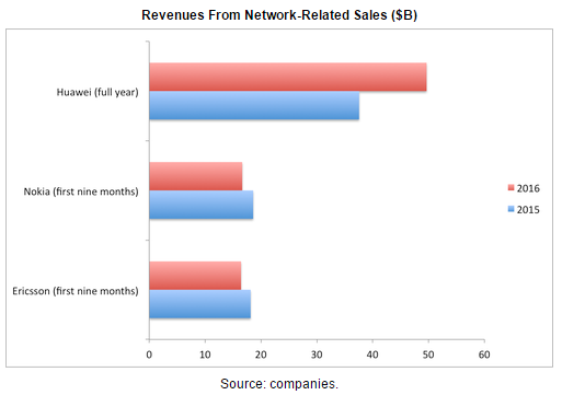 雖然華為、愛立信和諾基亞都在網(wǎng)絡(luò)設(shè)備服務(wù)市場上從運(yùn)營商和企業(yè)客戶那里賺取大量收入,但三家公司來自該市場收入占總比卻是不同,其中華為是66%,也就是三分之一來自手持設(shè)備市場(主要是智能手機(jī));占比最高的是愛立信,2016年前9個(gè)月高達(dá)94%;諾基亞同期網(wǎng)絡(luò)業(yè)務(wù)也占到總收入91%。盡管如此,2016年前9個(gè)月,愛立信來自網(wǎng)絡(luò)設(shè)備服務(wù)的收入下降了9.5%,諾基亞下降了11%。