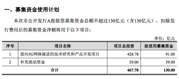 根據(jù)議案,本次募集資金主要用于投入中興通訊“面向5G網(wǎng)絡(luò)演進(jìn)的技術(shù)研究和產(chǎn)品開發(fā)項(xiàng)目”,包括蜂窩移動通訊網(wǎng)絡(luò)技術(shù)研究和產(chǎn)品開發(fā)、核心網(wǎng)技術(shù)研究和產(chǎn)品開發(fā)、傳輸與承載網(wǎng)技術(shù)研究和產(chǎn)品開發(fā)、固網(wǎng)寬帶技術(shù)研究和產(chǎn)品開發(fā)、大數(shù)據(jù)與網(wǎng)絡(luò)智能技術(shù)研究和產(chǎn)品開發(fā)。該項(xiàng)目計(jì)劃總投資428.78億元,擬使用募集資金91億元。另外39億元用于補(bǔ)充流動資金。