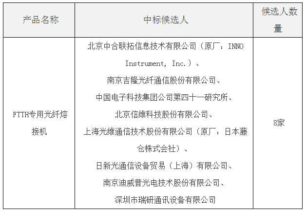 本次集采共有8家候選入圍,分別為北京中合聯(lián)拓信息技術(shù)有限公司、南京吉隆光纖通信股份有限公司、中國(guó)電子科技集團(tuán)公司第四十一研究所、北京信維科技股份有限公司、上海光維通信技術(shù)股份有限公司、日新光通信設(shè)備貿(mào)易(上海)有限公司、南京迪威普光電技術(shù)股份有限公司和深圳市瑞研通訊設(shè)備有限公司。
