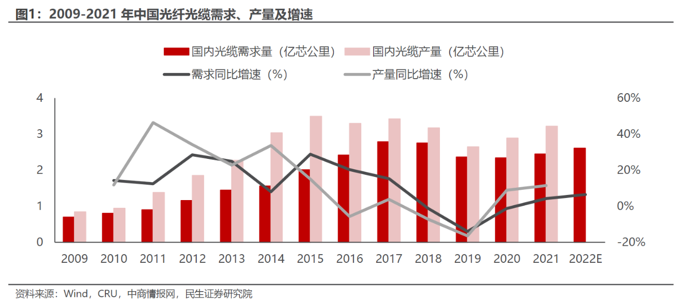 相關(guān)數(shù)據(jù)顯示,2022年1-7月國內(nèi)光纜產(chǎn)量累計為1.99億芯公里,累計同比增長19%,2022年至今增速顯著高于同期,以單月數(shù)據(jù)來看,2022年7月光纜產(chǎn)量為3275.4萬芯公里,同比增長25%。此外,在F5G和東數(shù)西算等需求帶動下,2022年需求量也大幅提升,驗證國內(nèi)光纖光纜行業(yè)景氣抬升。