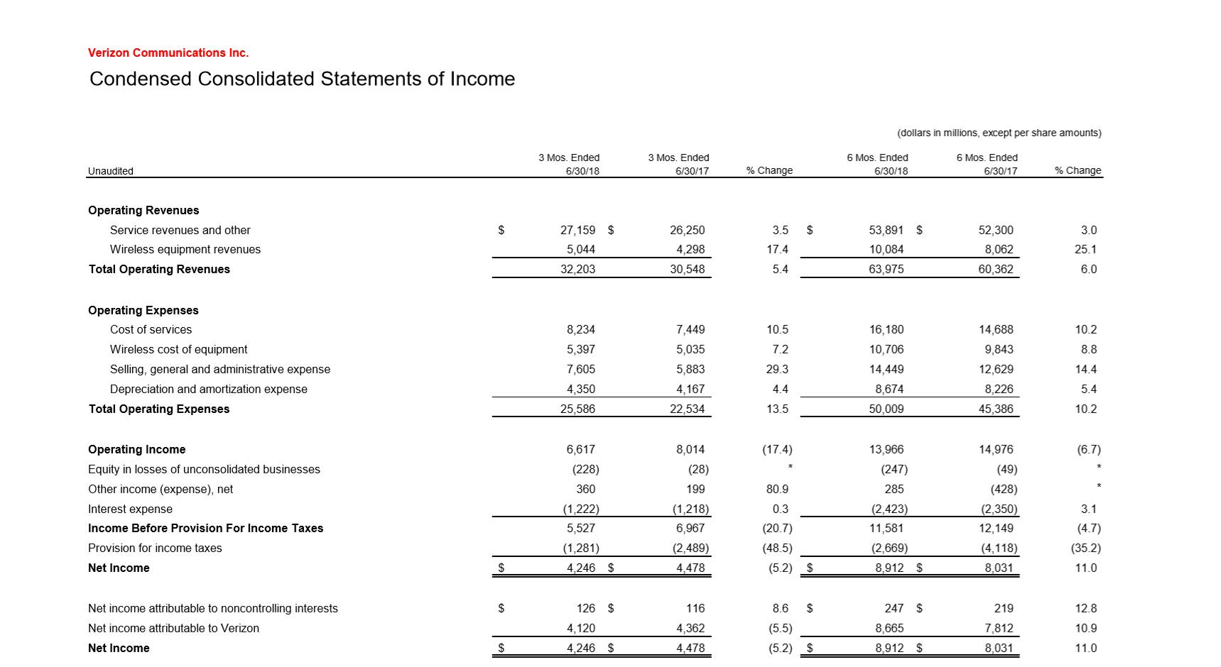 Verizon本季度營(yíng)業(yè)收入為322億美元,較2017年同期增長(zhǎng)5.4%,凈收入下降5.2%至42億美元。該運(yùn)營(yíng)商表示,Verizon的稅后收入為9億美元,主要原因是其Go90視頻服務(wù)被關(guān)閉。分部門來(lái)看,Verizon Wireless收入為224.49億美元,同比增長(zhǎng)5.5%。Verizon Wireline收入為74.59億美元,同比下滑3.4%。Verizon Wireless強(qiáng)勁的收入增長(zhǎng)勢(shì)頭和運(yùn)營(yíng)業(yè)績(jī)突出了Verizon Communications Inc. 2018年第二季度的業(yè)績(jī)。