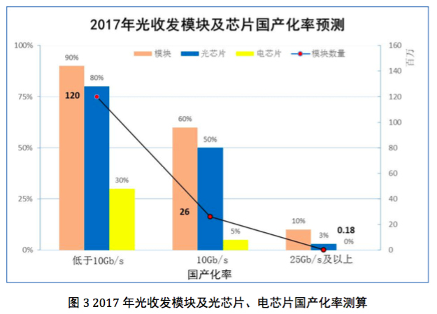 根據(jù)咨詢機構以及行業(yè)供給情況給出的光收發(fā)模塊、光芯片、電芯片國產(chǎn)化率測算數(shù)據(jù),10Gb/s速率的光芯片國產(chǎn)化率接近50%,25Gb/s 及以上速率的國產(chǎn)化率遠遠低于 10Gb/s速率,國內供應商可以提供少量的25Gb/s PIN器件/APD器件外,25Gb/s DFB激光器芯片剛剛完成研發(fā)。25Gb/s速率模塊使用電芯片基本依賴進口。
