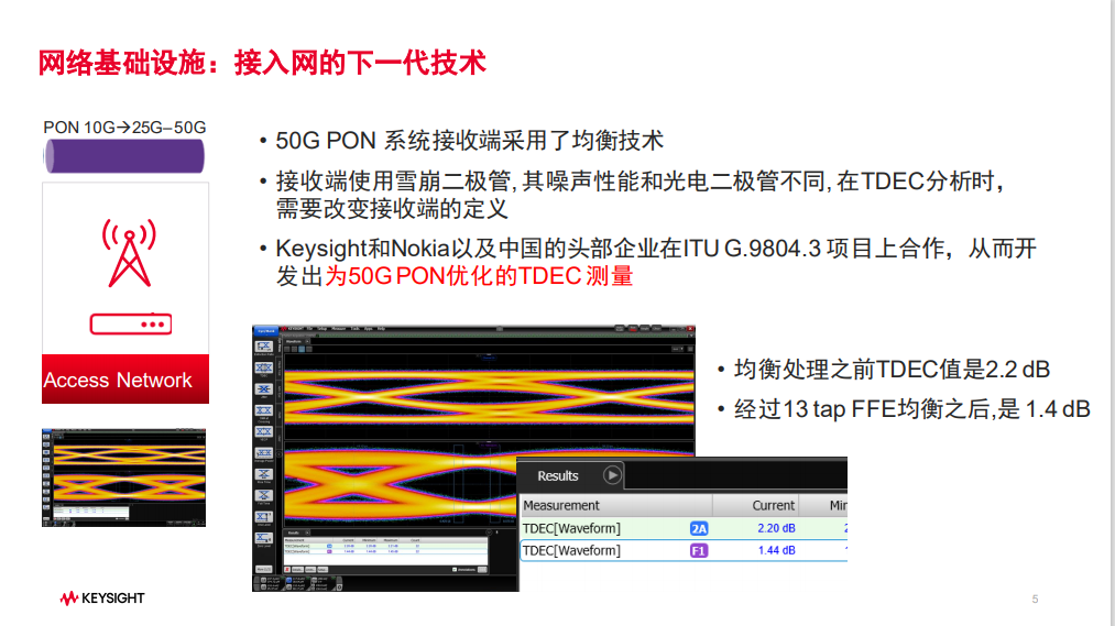 根據(jù)工信部的最新數(shù)據(jù),截至2022年10月底,全國(guó)共有110個(gè)城市達(dá)到千兆城市建設(shè)標(biāo)準(zhǔn),千兆城市平均城市家庭千兆光纖網(wǎng)絡(luò)覆蓋率超過(guò)100%,實(shí)現(xiàn)城市家庭千兆光網(wǎng)全覆蓋。隨著各省市對(duì)“千兆光網(wǎng)”政策的大力推進(jìn),10G PON技術(shù)正逐漸完成接入網(wǎng)升級(jí)。而下一代接入網(wǎng)技術(shù)開(kāi)發(fā)正在路上,今年9月,IEEE和ITU-T已經(jīng)完成了25G和50G PON的標(biāo)準(zhǔn)制定。是德科技預(yù)計(jì)2023年底將會(huì)有25G、50G商業(yè)化產(chǎn)品發(fā)布,2024/2025開(kāi)始商業(yè)化部署,中國(guó)則領(lǐng)先其他地區(qū)2-3年時(shí)間,直接從10G PON跨越到50G PON的部署。針對(duì)25G、50G PON的預(yù)研,是德科技推出了相應(yīng)的測(cè)試技術(shù),測(cè)試軟件和硬件,加快市場(chǎng)應(yīng)用。公司和中國(guó)以及其他國(guó)家的頭部企業(yè)在ITU G.9804.3 項(xiàng)目上緊密合作,開(kāi)發(fā)出為50G PON優(yōu)化的TDEC 測(cè)量。