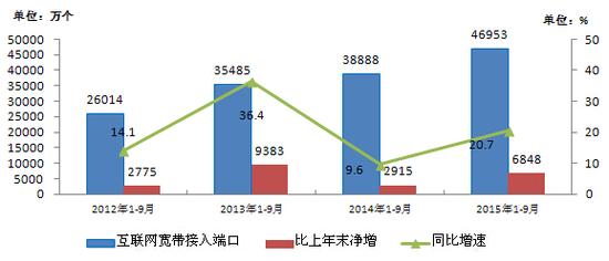 圖10.2012-2015年1-9月互聯(lián)網(wǎng)寬帶接入端口發(fā)展情況