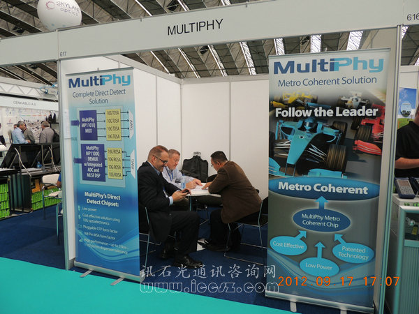 MULTIPHY 重點推出城域相干解決方案,該解決方案利用了公司專利的技術,可以實現(xiàn)城域相干收發(fā)器最低的功耗。同時,公司還推出100G 直接檢測 MUX/DEMUX芯片組,包括MP1101Q 100G MUX發(fā)射芯片。據(jù)公司銷售副總Neal介紹這一芯片組已經成功通過和住友的ELD5401QK系列的EML芯片的互通測試。 |