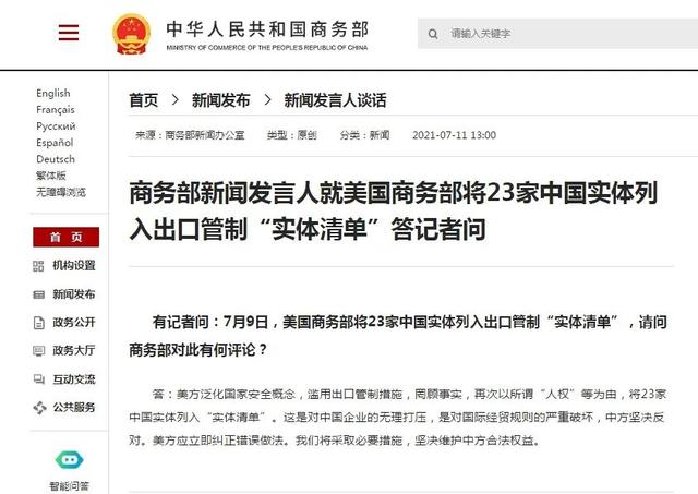 對此,中國商務(wù)部網(wǎng)站7月11日公布商務(wù)部新聞發(fā)言人就美國商務(wù)部將23家中國實(shí)體列入出口管制“實(shí)體清單”答記者問。