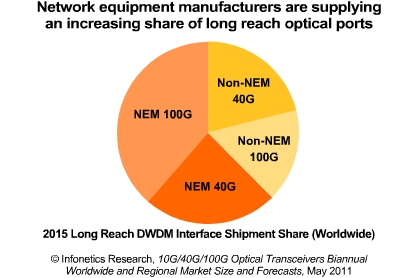 “與10年前形成鮮明對(duì)比的一個(gè)現(xiàn)實(shí)是,對(duì)于具備良好成本控制和廣泛產(chǎn)品線的主要供應(yīng)商,10G收發(fā)器市場(chǎng)是一個(gè)很好的棲身之地。不幸的是,一些器件供應(yīng)商和網(wǎng)絡(luò)設(shè)備制造商(NEMs)提供了越來(lái)越多的40G/100G長(zhǎng)距離端口,致使光模塊制造商爭(zhēng)奪到這個(gè)日益縮小的市場(chǎng)。這對(duì)于許多40G/100G轉(zhuǎn)發(fā)器供應(yīng)商將是一個(gè)極小的市場(chǎng),而可能直到2013年或更晚網(wǎng)絡(luò)設(shè)備制造商才提供相關(guān)的外包業(yè)務(wù)。” Infonetics Research公司的光學(xué)分析師Andrew Schmitt如是預(yù)計(jì)。