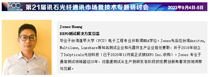 畢業(yè)于臺灣逢甲大學(xué)(FCU)電子工程專業(yè)并取得MBA學(xué)位。Jones 于2018年創(chuàng)立了 InOpticals 光創(chuàng)科技(已于2020年12月底正式被 EXFO Inc.收購)。Jones 專注于通信測試領(lǐng)域超過20年,對高速測試從生產(chǎn)到研發(fā)各階段的發(fā)展創(chuàng)新有著深刻地洞察與見解。