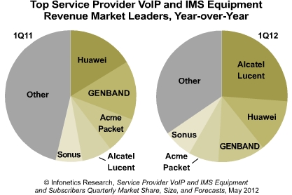 2012年第一季度,阿爾卡特朗訊在服務(wù)提供商VoIP和IMS收入、市場(chǎng)份額上翻倍,居全球市場(chǎng)份額第一,超越了去年前兩名,華為和GENBAND。