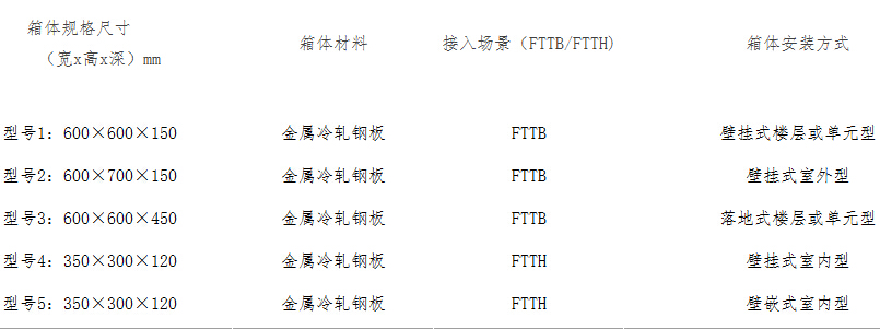 產(chǎn)品主要技術(shù)指標(biāo):廠商應(yīng)具備報(bào)名產(chǎn)品中所有規(guī)格和型號(hào)的生產(chǎn)及供貨能力方可參與產(chǎn)品的投標(biāo)。寬帶接入用綜合配線箱的采購型號(hào)見下表: