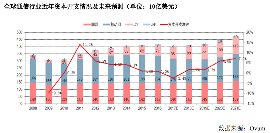 得益于各國政策支持和大量的技術(shù)研發(fā)投入,全球通信產(chǎn)業(yè)得到了較快發(fā)展。電信傳輸、城域和接入網(wǎng)的發(fā)展路標(biāo)都經(jīng)歷過數(shù)次升級(jí)。電信傳輸網(wǎng)2013年來在 4G 網(wǎng)絡(luò)反向驅(qū)動(dòng)下,開始向100G和200G帶寬過渡,2017年網(wǎng)絡(luò)已基本完成向更高速的全面升級(jí)。城域網(wǎng)實(shí)現(xiàn)大型數(shù)據(jù)中心間的交互全球電信投資的不斷增長(zhǎng)為光通信行業(yè)的發(fā)展奠定了良好的基礎(chǔ),而光模塊作為光通信設(shè)備的重要組成部分,將受益于光通信市場(chǎng)的快速發(fā)展。根據(jù)ICCSZ統(tǒng)計(jì),截至2017年三季度末,全球固網(wǎng)寬帶用戶達(dá)9.13億,環(huán)比增長(zhǎng)2.38%,寬帶用戶穩(wěn)步增長(zhǎng)成為拉動(dòng)通信行業(yè)增長(zhǎng)的重要力量,并推動(dòng)電信運(yùn)營商不斷升級(jí)移動(dòng)寬帶網(wǎng)絡(luò)和光纖寬帶網(wǎng)絡(luò),推動(dòng)全球電信資本支出不斷增長(zhǎng)。Ovum數(shù)據(jù)顯示,全球通信行業(yè)資本開支將從2018年起再次進(jìn)入增長(zhǎng)通道。