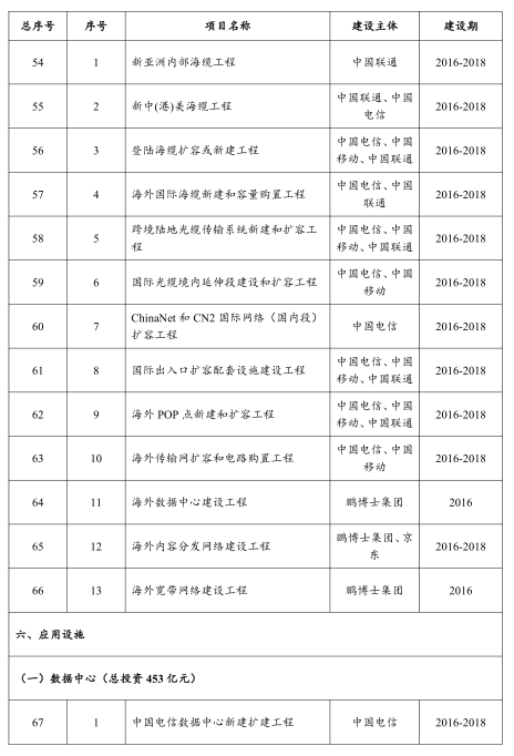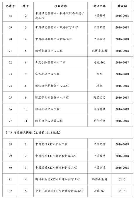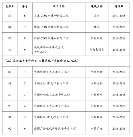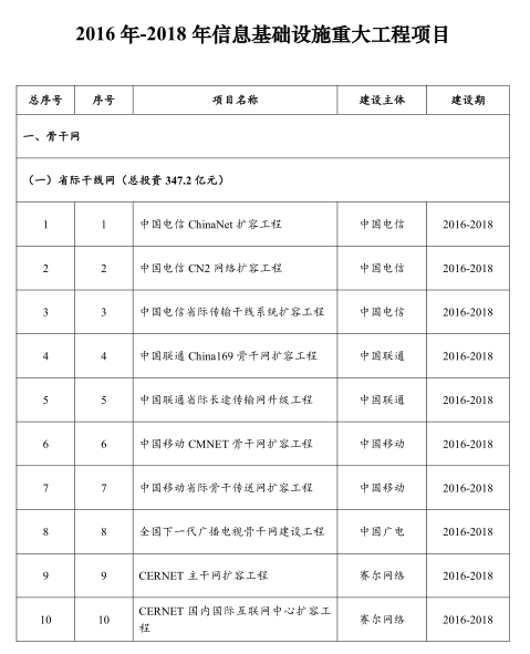 為保障上述任務(wù)和目標(biāo)的實(shí)現(xiàn),2016-2018 年信息基礎(chǔ)設(shè)施建設(shè)共需投資1.2 萬(wàn)億元。為發(fā)揮重大工程的引領(lǐng)帶動(dòng)作用,擬重點(diǎn)推進(jìn)骨干網(wǎng)、城域網(wǎng)、固定寬帶接入網(wǎng)、移動(dòng)寬帶接入網(wǎng)、國(guó)際通信網(wǎng)和應(yīng)用基礎(chǔ)設(shè)施建設(shè)項(xiàng)目92項(xiàng),涉及總投資9022億元。