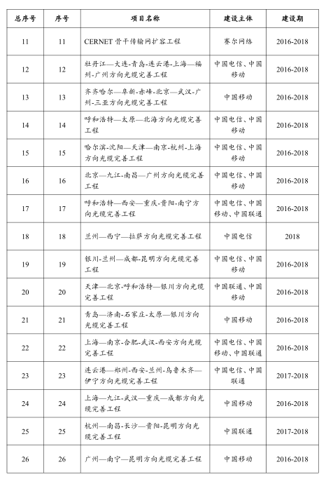 (一)骨干網(wǎng)。優(yōu)化完善既有“八縱八橫”光纜網(wǎng)絡(luò)架構(gòu),及時(shí)組織老舊光纜更新?lián)Q代,積極推進(jìn)超高速、大容量光傳輸技術(shù)部署。圍繞互聯(lián)網(wǎng)骨干節(jié)點(diǎn)和新型交換中心,進(jìn)一步優(yōu)化互聯(lián)網(wǎng)骨干網(wǎng)網(wǎng)間架構(gòu),全面提升整體承載和處理能力。重點(diǎn)推進(jìn)33 個(gè)項(xiàng)目,涉及資金495 億元。