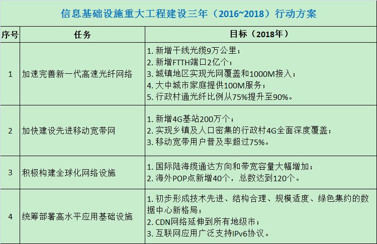 ICCSZ訊 昨日,國(guó)家發(fā)改委、工信部印發(fā)了《信息基礎(chǔ)設(shè)施重大工程建設(shè)三年行動(dòng)方案》,明確2016年至2018年,投資1.2萬(wàn)億元,重點(diǎn)完善新一代高速光纖網(wǎng)絡(luò)、加快建設(shè)先進(jìn)移動(dòng)寬帶網(wǎng)、積極構(gòu)建全球化網(wǎng)絡(luò)設(shè)施、強(qiáng)化應(yīng)用支撐能力建設(shè)。其中,擬重點(diǎn)推進(jìn)骨干網(wǎng)、城域網(wǎng)、固定寬帶接入網(wǎng)、移動(dòng)寬帶接入網(wǎng)、國(guó)際通信網(wǎng)和應(yīng)用基礎(chǔ)設(shè)施建設(shè)項(xiàng)目92項(xiàng),涉及總投資9022億元。ICCSZ現(xiàn)將《方案》的詳細(xì)目標(biāo)、任務(wù)以及投資整理如下: