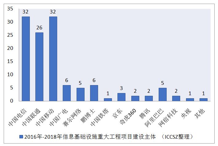看2016-2018信息基礎(chǔ)工程建設(shè)主體,中國(guó)電信、中國(guó)聯(lián)通和中國(guó)移動(dòng)依舊為建設(shè)主力,3家負(fù)責(zé)工程項(xiàng)目共計(jì)90項(xiàng)(包括共同建設(shè)項(xiàng)目);獲得電信基礎(chǔ)運(yùn)營(yíng)商的廣電建設(shè)項(xiàng)目?jī)H為6項(xiàng),相比移動(dòng)電信聯(lián)通還相差甚遠(yuǎn);賽爾網(wǎng)絡(luò)也獲得五項(xiàng)工程建設(shè),其中3項(xiàng)是CERNET主干網(wǎng)、國(guó)內(nèi)國(guó)際互聯(lián)網(wǎng)中心和骨干傳輸網(wǎng)的擴(kuò)容,1項(xiàng)是教育系統(tǒng)城域網(wǎng)建設(shè)。
