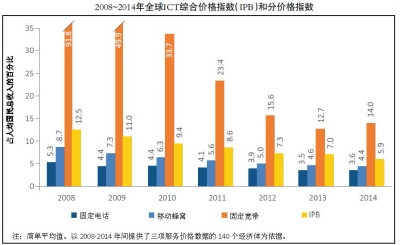 通過展示自數(shù)據(jù)收集開始以來,這一時期全球固定電話、移動蜂窩和固定寬帶分價格指數(shù)水平的演化,我們可以看到,固定寬帶價格在2008~2012年間顯著下降(-36%的年均復(fù)合增長率)。固定寬帶服務(wù)價格的下降在2012至2014年間趨緩(兩年間的年均復(fù)合增長率為-5%),盡管如此,一些發(fā)展中國家的平均固定寬帶價格依然相對難以承受。在2008~2014年期間,固定和移動電話服務(wù)的價格也在下跌,但由于固定電話和移動蜂窩的初始水平較低,其價格降速低于固定寬帶(分別-6%和-11%的年均復(fù)合增長率)。
