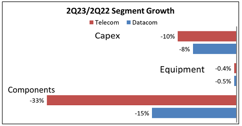 與光器件銷售額的急劇下降形成對(duì)比的是,2023年第二季度網(wǎng)絡(luò)設(shè)備的銷售額保持穩(wěn)定(下降0.4-0.5%)。這一異?,F(xiàn)象的原因是2021-2022年許多組件供不應(yīng)求時(shí),設(shè)備訂單大量積壓?,F(xiàn)階段,設(shè)備供應(yīng)商仍在追趕一年多前的訂單。