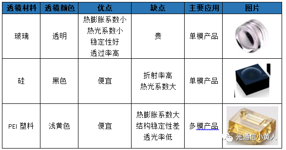 光模塊中應用到的透鏡按材料區(qū)分,一般有玻璃、硅、PEI塑料三種,優(yōu)缺點對比如下表。玻璃透鏡是傳統(tǒng)工藝中經常用的材料,常用于高端模塊;硅透鏡價格便宜,這兩年發(fā)展勢頭很猛烈,中低端COB、Box封裝模塊中已經大量應用了;PEI塑料透鏡在多模短距模塊中應用,最大的特點就是夠便宜。