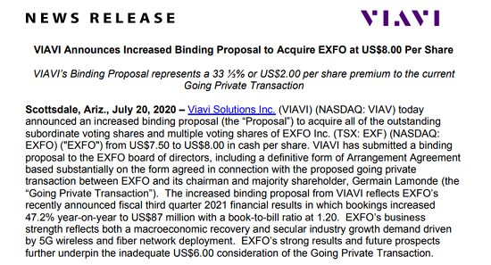 VIAVI的提案現(xiàn)在對EXFO的未稀釋估值約為4.59億美元,相比2021年6月4日(即私有化交易公告前一個交易日)納斯達克收盤價大幅溢價116%,比私有化交易項下6.00美元的代價要約高出33 ?%,也比VIAVI之前收購EXFO的提議溢價6.7%。