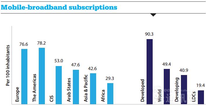 歐洲、美洲以及獨(dú)立國(guó)家聯(lián)合體區(qū)域擁有最高的固定寬帶普及率。