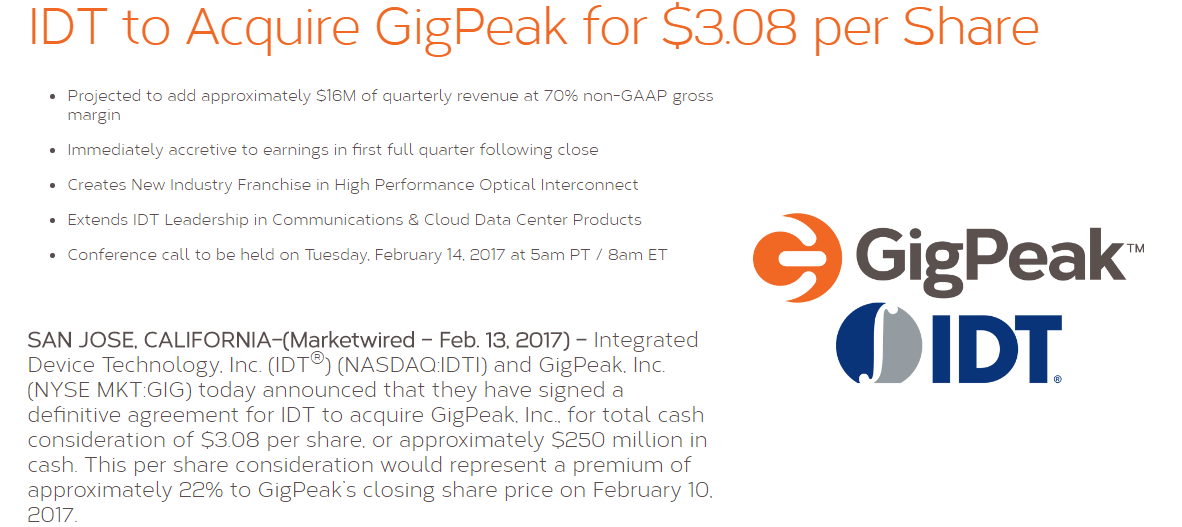 同一時間,GigPeak公司還宣布接受IDT提供的2.5億元(3.08元/股)并購價格,等并購交易完成后,GigPeak公司將為IDT公司提供高性能的光互連產(chǎn)品與技術,進一步加強IDT公司在實時互聯(lián)產(chǎn)品領域的領導地位。